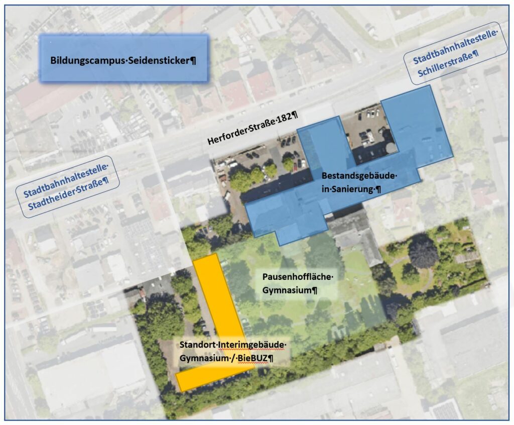 Das neue Gymnasium wird auf dem ehemaligen Firmengelände des Unternehmens Seidensticker an der Herforder Straße entstehen. Die Stadt Bielefeld hat das Gelände 2023 erworben und wird dort den sogenannten Bildungscampus Seidensticker errichten.